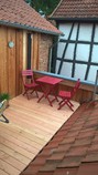 aus Douglasienholz. Schwimmende Unterkonstruktion auf abgedichtetem Flachdach zur Gewährleitung des Wasserabflusses.